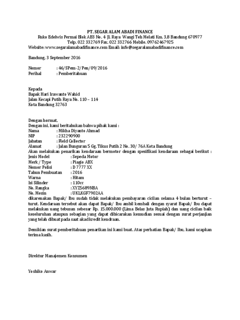 Contoh Surat Penarikan Kendaraan Berupa Motor Pdf